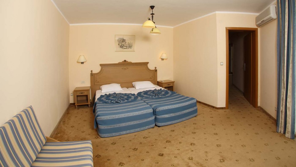 - Egyszobás apartman (33-38 négyzetméter). A lakosztályok 2 szobából állnak, de csak néhányuk rendelkezik összekötő ajtóval. A pótágy egy kanapéágy.