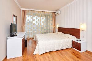- 1 hálószobás apartman - tengerre/parkra néző. Külön hálószoba franciaággyal vagy két különálló ággyal és nappali, kanapékkal (kanapéágy), étkezővel és konyhával. A konyha hűtőszekrénnyel, főzőlappal, mikrohullámú sütővel, páraelszívóval, vízforralóval, edényekkel és mosógéppel felszerelt.