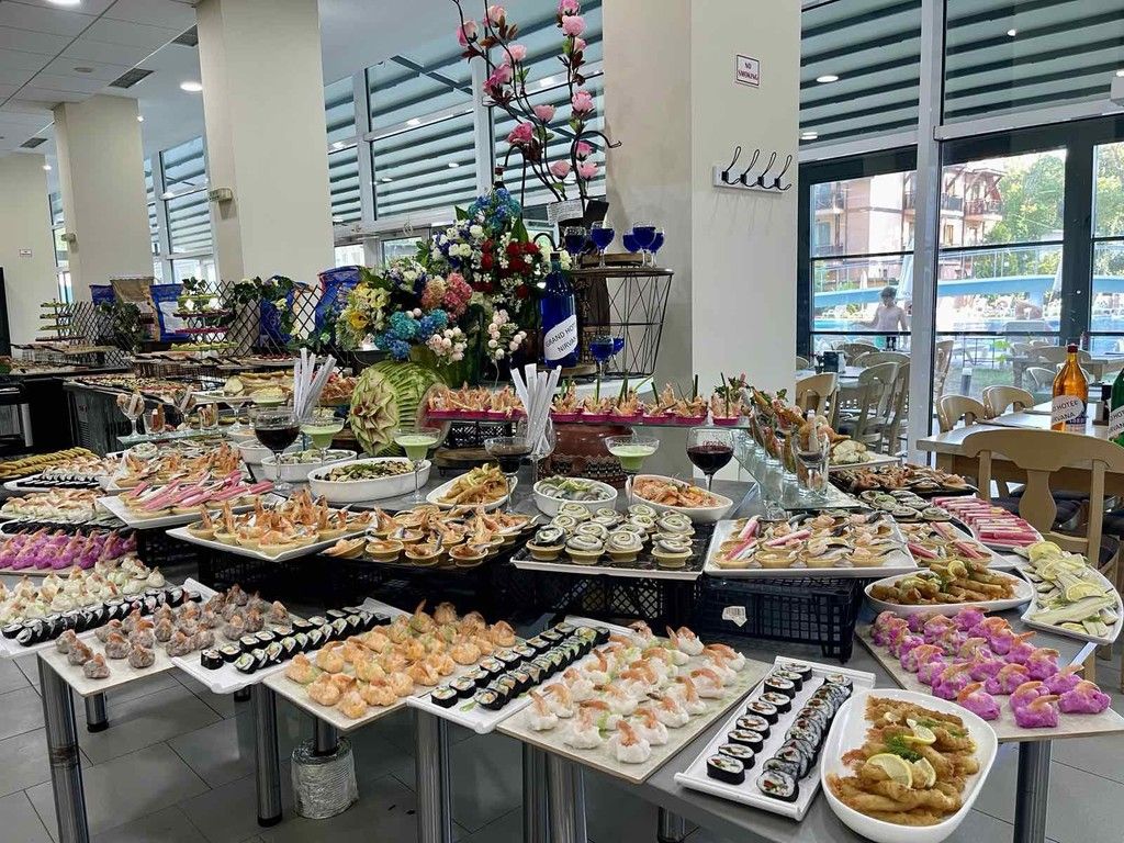 Széles salátaválaszték, édességek és péksütemények, hús- és vegetáriánus ételek, pizza, spagetti, desszertek, fagylalt és gyümölcsök stb.