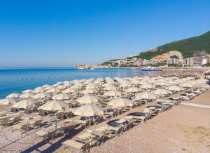 A strandon a napozóágyak és napernyők felár ellenében vehetők igénybe.